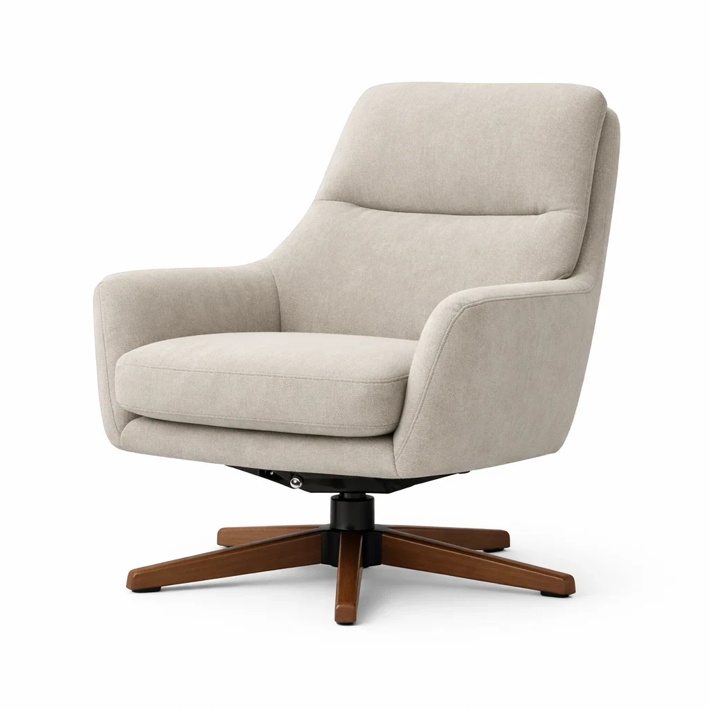 Sedia girevole in tessuto beige con base in legno e seduta imbottita